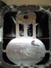 經(jīng)過以上現(xiàn)場排除液壓系統(tǒng)伺服閥組、電氣控制系統(tǒng)和油液清潔度等各方面因素后,檢查拆卸解體高調(diào)門油動機(jī),發(fā)現(xiàn)油動機(jī)底部高壓耐油石棉板已經(jīng)沖刷破損腐爛嚴(yán)重(如圖4、5)。