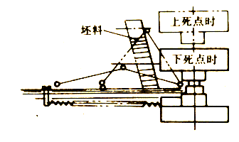 (2) 杠桿式送料裝置 在模具前設(shè)置儲(chǔ)料槽(斗)利用滑塊動(dòng)力將坯件送進(jìn)模內(nèi)。如圖14和圖15分別是杠桿式和楔鐵杠桿式送料裝置。這類裝置機(jī)構(gòu)簡(jiǎn)單、使用方便,適用于厚度大于1.5mm以上的平整、無(wú)毛刺的坯件。