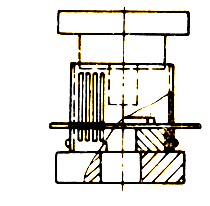 (6) 在裝有活動(dòng)擋料銷和固定卸料板的大型模具上,用凸輪或斜面機(jī)械控制擋料銷的位置(圖10f)。