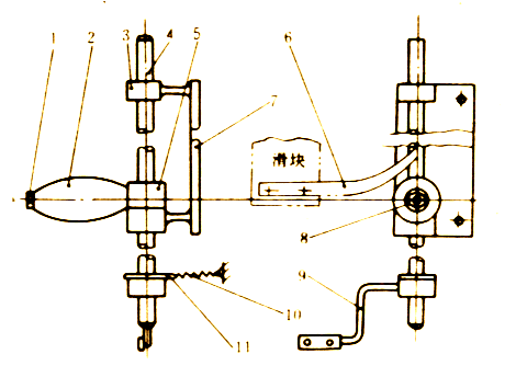 1―螺母 2―凸輪 3―支座 4―主軸 5―凸輪座 6―撥板 7―支架 8―螺桿 9―推桿 10―拉簧 11―勾板