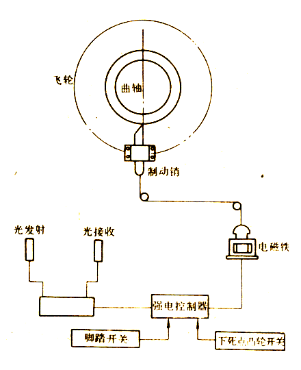 用腳踏下開關(guān)使電路接通,在電磁鐵作用下,凸輪轉(zhuǎn)位或制動銷下移,由彈簧力作用使轉(zhuǎn)鍵或直鍵與飛輪接合,滑塊起動。此時,如果人手進(jìn)入危險區(qū)內(nèi),光束被遮,立即改變電訊號,繼電器觸點(diǎn)輸出,在控制線路作用下,電磁鐵釋放,凸輪和制動銷復(fù)位,卡住擋板或插入齒圈撐牙內(nèi),又使曲軸與飛輪分離,曲軸停止轉(zhuǎn)動,滑塊在安全高度上停止。該裝置是利用設(shè)備原有的電磁鐵控制滑塊運(yùn)動,如果電磁鐵發(fā)生故障,會造成自動保護(hù)裝置的失靈。