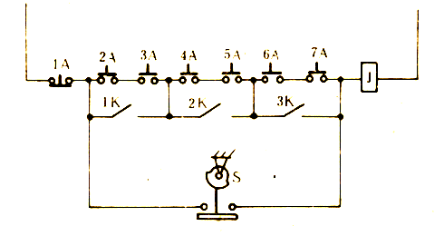它是一種用電器開關(guān)控制的保護(hù)裝置。起動滑塊時,將人手、限制在模外,實(shí)現(xiàn)隔離保護(hù)。只有操作者的雙手同時按下兩個按鈕時,圖22中的中間繼電器J才有電,電磁鐵動作,滑塊起動。圖22中的凸輪中開關(guān)S在下死點(diǎn)前處于開路狀態(tài),若中途放開任可一個開關(guān)時,電磁鐵都會失電,使滑塊停止運(yùn)動,直到滑塊到達(dá)下死點(diǎn)后,凸輪開關(guān)S才閉合,這時放開按鈕,滑塊仍能自動回程。