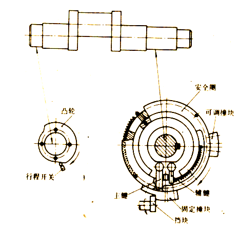 由于自動保護(hù)需要通過一系列電器和機(jī)械構(gòu)件的傳遞,所以制動要比發(fā)訊滯后一段時間。為了縮短制動時間,可適當(dāng)增加滑塊下行時的制動位置(增加擋塊或齒數(shù))。另外,可增加一個制動電磁鐵,用以專門控制保護(hù)裝置的動作,以克服上述裝置存在的缺陷。具體改進(jìn)如圖33和圖34所示。