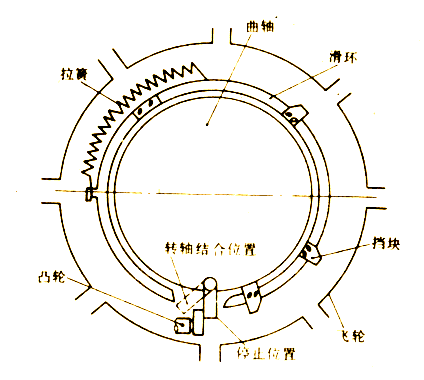 (2) 自動保護(hù) 光電自動保護(hù)的作用是:在壓機(jī)滑塊下行途中,若人手突然入模,則滑塊可自動停止。實(shí)現(xiàn)自動保護(hù)時必須對剛性離合器的操縱系統(tǒng)進(jìn)行改裝。如圖30、圖31和圖32所示分別是對直鍵式、單轉(zhuǎn)鍵式和雙轉(zhuǎn)鍵式剛性離合器改裝后的結(jié)構(gòu)示意圖。