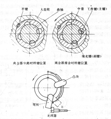 (1) 剛性離合器及其控制機(jī)構(gòu) 如圖7所示為雙轉(zhuǎn)鍵離合器,它有二個(gè)轉(zhuǎn)鍵:工作鍵(主鍵)和填充鍵(輔鍵),兩者通過拉板連接得以聯(lián)動。主鍵的作用是擔(dān)負(fù)傳遞全部沖壓工作行程的動力;鋪鍵的作用,一是調(diào)整模具時(shí)可使曲軸反轉(zhuǎn),二是防止曲軸旋轉(zhuǎn)發(fā)生“超前”現(xiàn)象。這種“超前”現(xiàn)象是由于連桿機(jī)構(gòu)的自重作用或其它原因(如彈性卸料或壓料裝置的作用力)造成曲軸轉(zhuǎn)速在工作行程或回程中發(fā)生短暫的超過大齒輪轉(zhuǎn)速的現(xiàn)象。“超前”現(xiàn)象會造成主鍵與中套的撞擊。