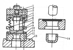 1―卸料桿 2―沖壓件 3―定料銷 4―頂板 5―凹模 6―下頂桿 7―螺釘或銷釘 8―下模板 9―凸模 10―導(dǎo)柱 11―導(dǎo)套 12―上模板 13―模柄 14―上頂桿
