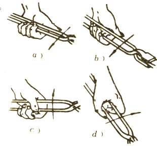 在鍛造過(guò)程中,掌鉗者需不斷地翻轉(zhuǎn)和移動(dòng)坯料。不同的翻轉(zhuǎn)方向,有不同的握鉗方法。圖1所示為翻料時(shí)的幾種握鉗方法。