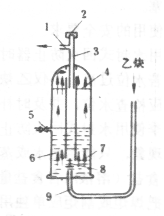 2) 中壓閉合式水封回火防止器。這種回火防止器類型很多,現(xiàn)以圖7所示,說明其構(gòu)造和原理。正常工作時,乙炔由進(jìn)氣管9流入,經(jīng)逆止閥8、分氣板7、分水板4和分水管3(減少乙炔帶水),由出氣管1輸出。發(fā)生回火時,筒內(nèi)壓力增高,壓迫水面,并通過水層使逆止閥作瞬時關(guān)閉,進(jìn)氣管暫停供氣。同時,爆炸氣體將筒體頂部的防爆膜2沖破散發(fā)到大氣中。由于水層也起著隔水作用。因此能比較有效地防止乙炔發(fā)生器的爆炸。