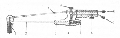 1―焊嘴 2―混合氣管 3―射吸管 4―噴嘴 5―氧氣閥 6―氧氣導(dǎo)管 7―乙炔導(dǎo)管 8―乙炔閥