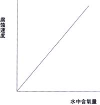 ??? 按機(jī)理,可把腐蝕分為化學(xué)腐蝕和電化學(xué)腐蝕兩大類。一般化學(xué)腐蝕無電流產(chǎn)生,電化學(xué)腐蝕伴有電流的產(chǎn)生。對鍋爐受力元件來說,水側(cè)以電化學(xué)腐蝕為主,火側(cè)(或煙氣側(cè))以化學(xué)腐蝕為主。氧腐蝕實(shí)際上是一種電化學(xué)腐蝕,其機(jī)理為:由于鍋爐水是一種有極性的電解質(zhì),在水的極性分子的吸引下,鋼材表面的一部分鐵原子,開始移入爐水而成為帶正電的鐵離子,而鋼材上保留多余的電子帶負(fù)電荷。若鐵離子不斷進(jìn)入鍋水,則使鋼板(管)上逐漸出現(xiàn)坑洞,產(chǎn)生了腐蝕。鍋水中的溶解氧具有去極化作用,會(huì)使這一過程加劇。而去極化作用的強(qiáng)弱與含氧量多少有關(guān),也就是說溶解氧的含量決定著腐蝕的強(qiáng)弱,而兩者成線性正比關(guān)系。如圖所示。