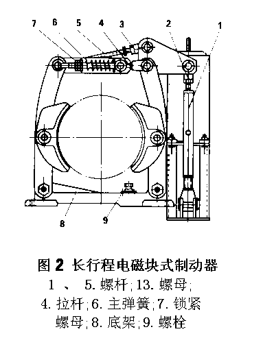 長(zhǎng)行程電磁塊式制動(dòng)器工作時(shí)制動(dòng)力矩穩(wěn)定,閉合動(dòng)作較快,其制動(dòng)力矩可通過調(diào)整彈簧的張力進(jìn)行較為精確的調(diào)整,安全性高,在起升機(jī)構(gòu)中應(yīng)用得比較廣泛。